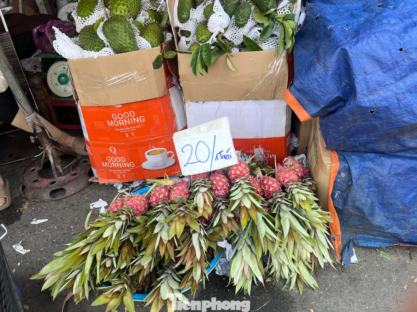 Quả khóm nhỏ, hàng dạt có cuống lá héo, tiểu thương xả hàng còn 20.000 đồng/trái nhưng vắng khách mua