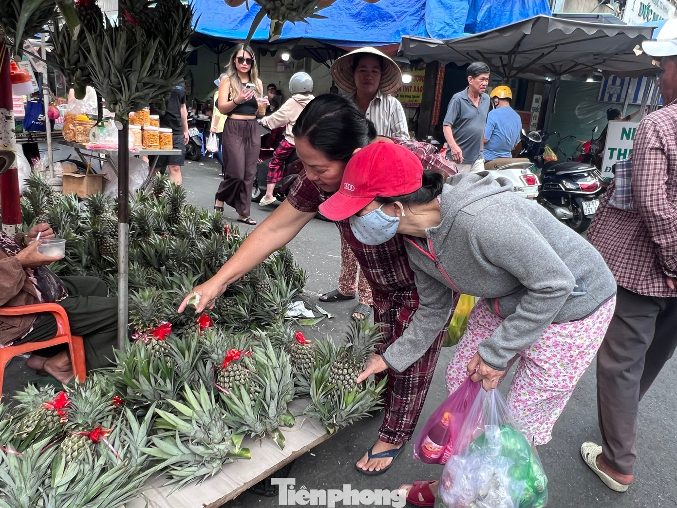Trong khi những quả khóm to, tươi tắn có giá tới 40.000 - 50.000 đồng/quả. "Mình bày mâm cúng bàn thờ gia tiên trong năm mới nên phải chọn quả ngon, hàng tốt để cầu may mắn, tài lộc suốt năm. Dù giá cao cũng chấp nhận chứ không chọn hàng giảm giá" - chị Thiên An (ngụ phường Vườn Lài) khẳng định